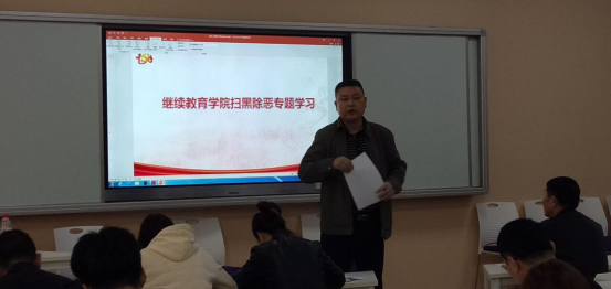 崔建明院长首先领学了习近平总书记关于扫黑除恶专项斗争的重要批示及《桂林市扫黑除恶专项斗争应知应会八十问》,重点学习了七十八问的9个假如和七十九问的10个也许。领学以后,崔院长指出,开展扫黑除恶专题学习,一是要提高认识。开展扫黑除恶专项斗争,是以习近平同志为核心的党中央作出的一项重大决策,事关社会大局稳定和国家长治久安,事关人心向背和基层政权巩固,事关进行伟大斗争、建设伟大工程、推进伟大事业、实现伟大梦想,是一项必须完成的政治任务,全院上下必须进一步提高政治站位,坚定不移落实好中央的决策部署,确保扫黑除恶专项斗争取得实效;二是要加强宣传工作。开展扫黑除恶专项斗争,是全国在全面建成小康社会的决胜阶段、中国特色社会主义进入新时代的关键时期作出的一项重大部署,是提升人民群众获得感、幸福感、安全感的必然要求,是推动从严治党向基层延伸,巩固党的执政根基的切实举措,也是推动学校依法治校的重要举措,必须充分运用学院宣传媒体,强化扫黑除恶专项斗争的宣传教育,营造对黑恶势力人人喊打的浓厚氛围。 三是动员广大师生参与到扫黑除恶专项斗争工作中来,提醒员工务必检点自己的行为,凡事三思而行,别一不小心成为黑恶势力发展的重点对象,成为黑恶势力的帮凶。