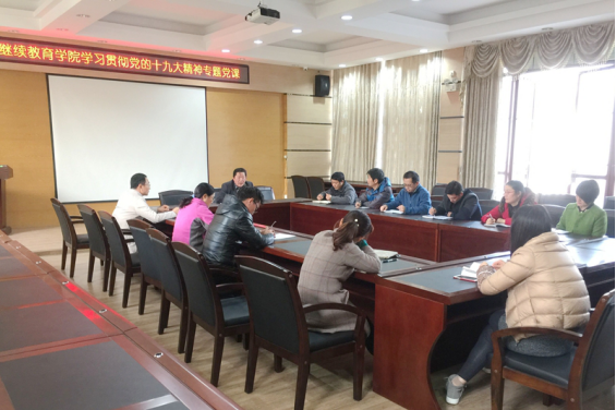 会上,曹文献院长传达了学校党委中心组(扩大)关于十九大精神专题理论学习会会议精神,就十九大报告进行了导读,要求全体党员同志要按照中共中央、教育部党组和自治区党委关于学习宣传贯彻党的十九大精神通知要求,把学习宣传贯彻党的十九大精神和习近平总书记系列重要讲话精神作为当前和今后一段时期学院工作的重点,切实以十九大精神指导工作,不断推进新形势下学校继续教育事业的发展。与会人员结合十九大精神的学习,围绕本部门工作实际谈了学习宣传贯彻十九大精神的举措。