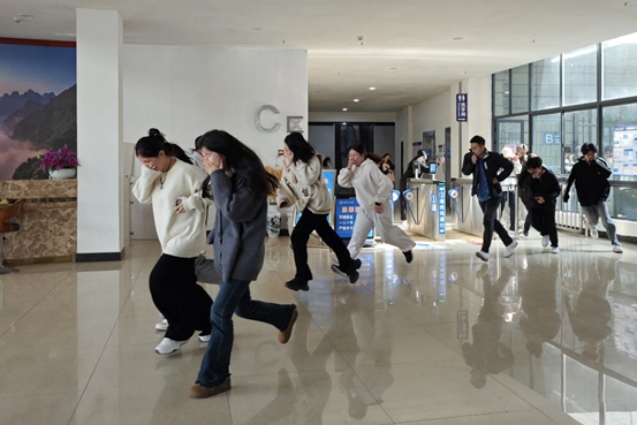 讲座结束后,紧张而有序的“师生安全疏散演练”随即展开。在工作人员的引导下,学生们迅速按照既定疏散路线,采取俯身低姿、捂住口鼻的正确逃生姿势,沿着指定的安全通道迅速撤离至安全区域。