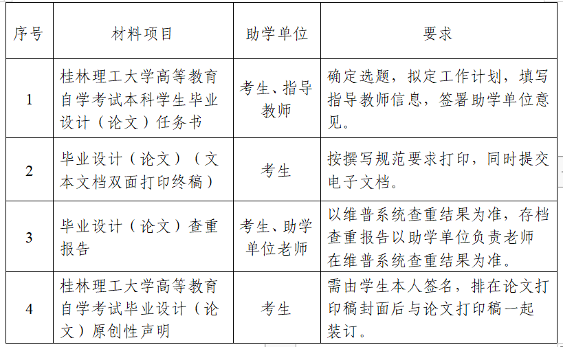 毕业设计(论文)答辩工作结束之后,各助学单位必须做好毕业设计(论文)工作有关资料的收集、整理和归档工作,考生提交材料清单如下: