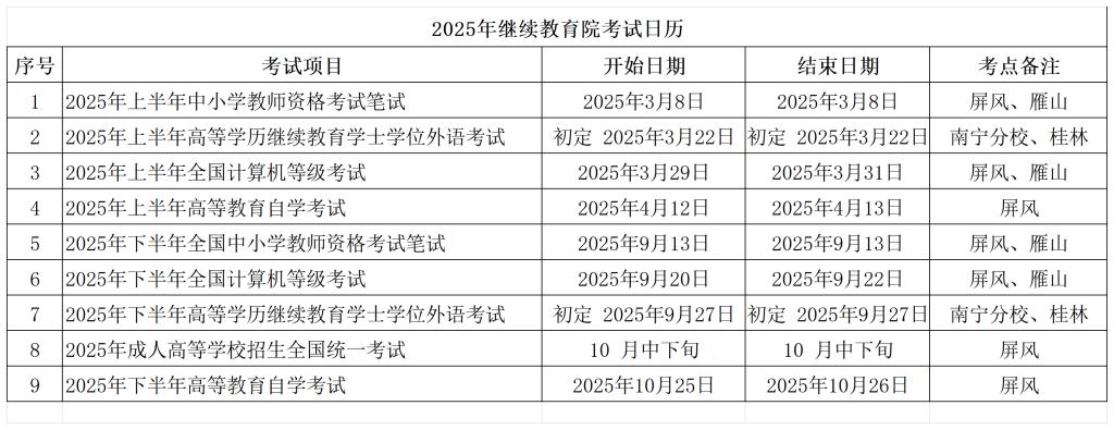 2025年考试日历