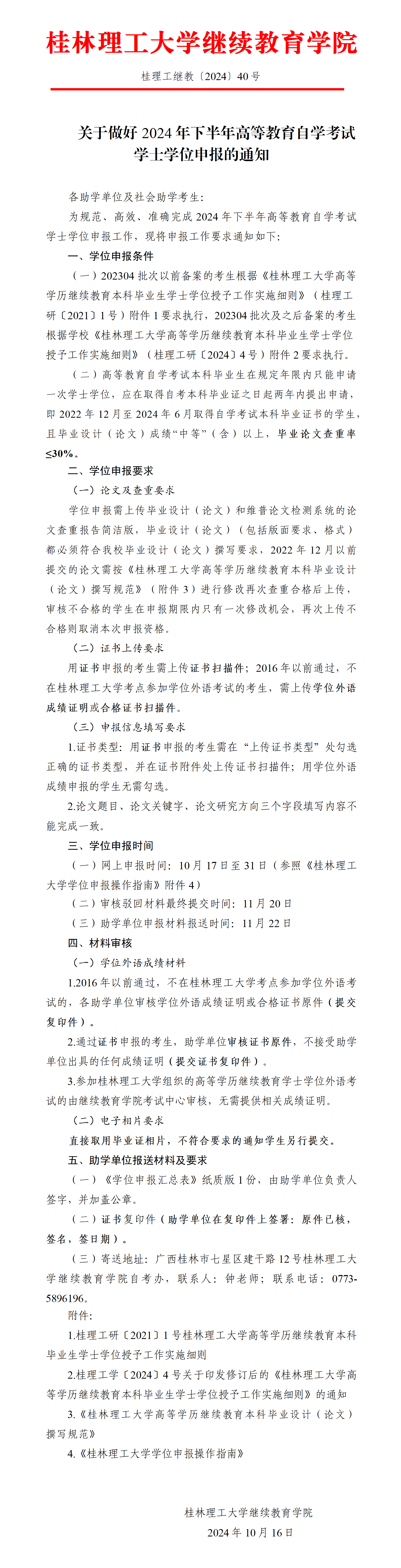 关于做好2024年下半年高等教育自学考试学士学位申报的通知 发布者:自考办(考试中心) 2024-10-16 已阅人次 (一审:钟小淘 二审:徐小卜 三审:李衡) 附件【附件1:桂理工研〔2021〕1 号taptap点点官方网站高等学历继续教育本科毕业生学士学位授予工作实施细则.pdf】已下载次 附件【附件2:桂理工学〔2024〕4 号关于印发修订后的《taptap点点官方网站高等学历继续教育本科毕业生学士学位授予工作实施细则》的通知.pdf】已下载次 附件【附件3:taptap点点官方网站高等学历继续教育本科毕业设计(论文)撰写规范.doc】已下载次 附件【附件4:taptap点点官方网站学位申报操作指南.docx】已下载次 上一条:关于做好2024年下半年高等教育自学考试毕业资格审定工作的通知 下一条:关于做好2024年下半年高等教育自学考试新生报名及备案相关工作的通知 关注我们