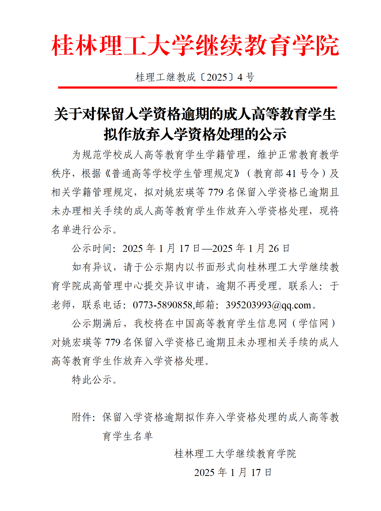 关于对保留入学资格逾期的成人高等教育学生拟作放弃入学资格处理的公示 发布者:成高管理中心 2025-01-18 已阅人次 (一审:于德新 二审:林文钊 三审:李衡) 附件【附件:保留入学资格逾期拟作弃入学资格处理的成人高等教育学生名单.xlsx】已下载次 上一条:taptap点点官方网站2025年高等学历继续教育校外教学点遴选结果的公示 下一条:关于做好成人高等教育学生前置学历资格复查工作的通知 关注我们