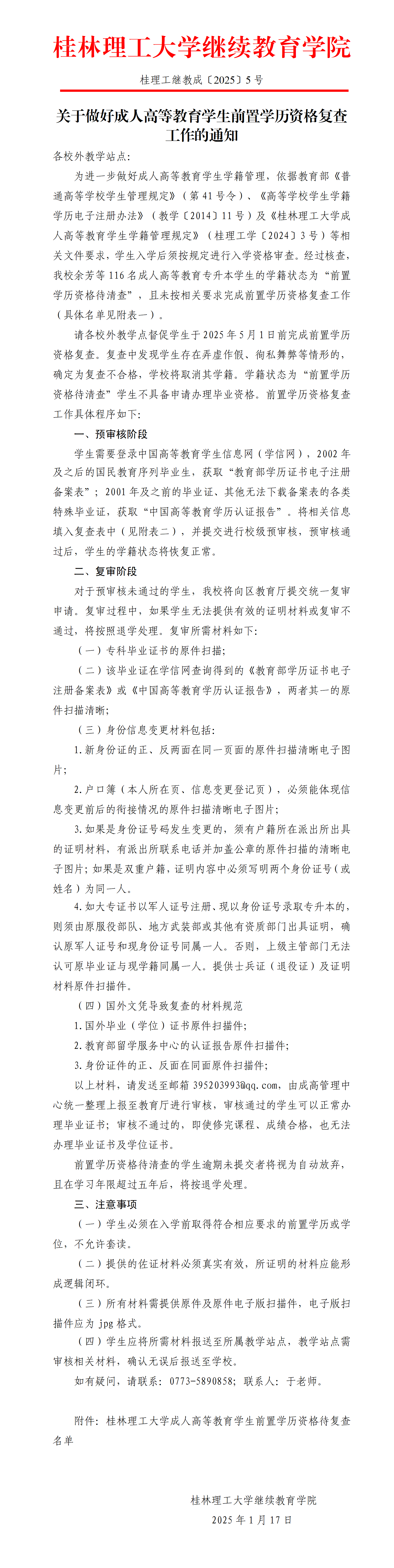 关于做好成人高等教育学生前置学历资格复查工作的通知 发布者:成高管理中心 2025-01-17 已阅人次 (一审:于德新 二审:林文钊 三审:李衡) 附件【附表一 前置学历资格待复查名单116人.xlsx】已下载次 附件【附表二 专升本复查表.xls】已下载次 上一条:关于对保留入学资格逾期的成人高等教育学生拟作放弃入学资格处理的公示 下一条:关于做好2025年春季学期成人高等教育学生学籍异动工作的通知 关注我们